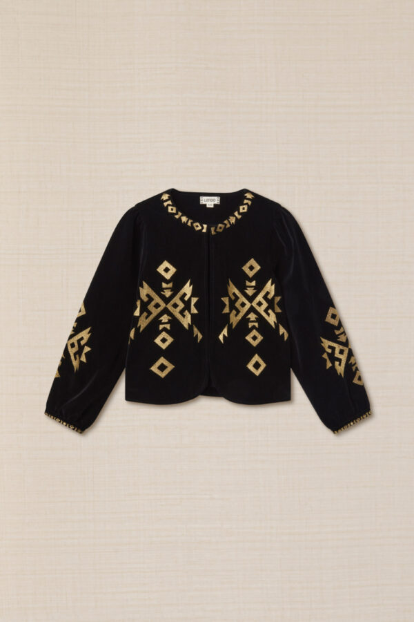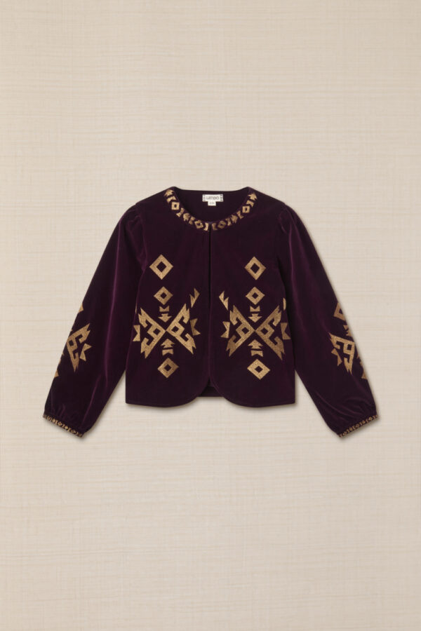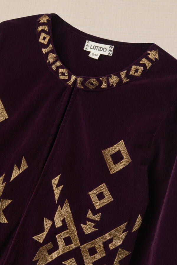 Esta chaqueta de terciopelo bordado geometrías es la pieza clave para un look para quienes buscan un equilibrio entre moda y funcionalidad. Combínala con cualquier prenda para un look versátil y elegante.