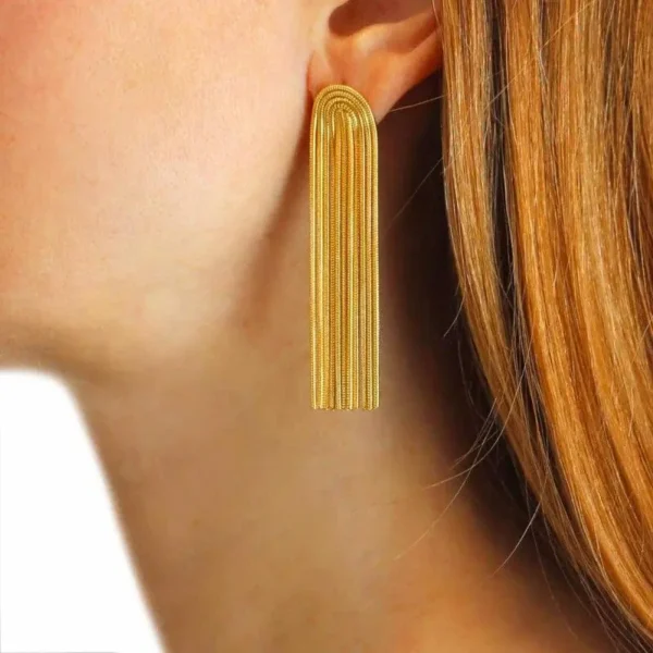 Atrévete con nuestro espectacular diseño cortina, ideal para destacar en fiestas y eventos nocturnos. Favorecedores, llamativos y llenos de movimiento, estos pendientes de acero quirúrgico están disponibles en dorado o plateado. Con 65 mm de largo, cierre a presión tipo mariposa y la ventaja de poder mojarlos sin oxidarse ni causar alergias. ¡Deslumbra en cada ocasión especial!